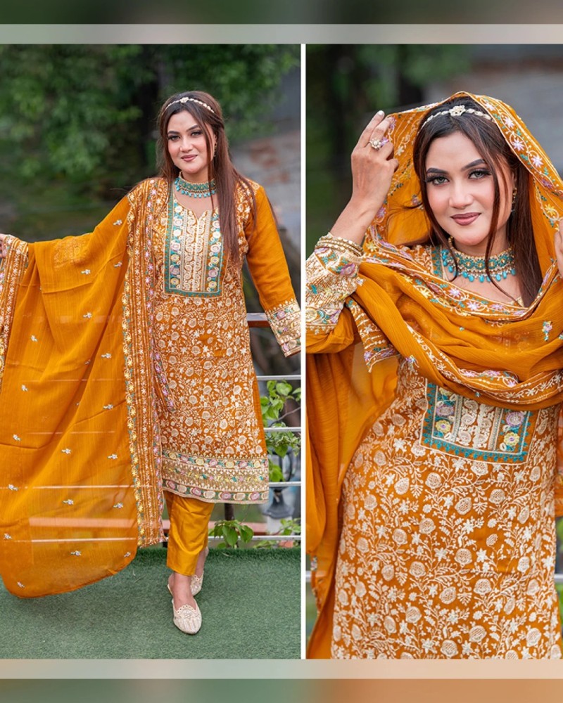 White Gold Chiffon Three Piece Dress | Elegant Party Wear Collection ||-JR-184